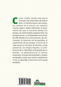 Crecer cuesta: quizás este sea el mensaje más importante de todo el libro. La transformación del cuerpo, los cambios en el vínculo con nosotros (mamá, papá o adulto referente), el alejamiento de casa, el creciente tiempo con amigos, las interminables exploraciones, las transgresiones, la inestabilidad emocional, las dificultades en la comunicación, las discusiones, la inmersión en las pantallas, el surgimiento de las parejas, el inicio de la vida sexual, el consumo de alcohol y otras sustancias, los riesgos mayores, la construcción de su identidad, la búsqueda de un sentido… La adolescencia es un camino empinado, al borde del acantilado y repleto de desafíos: mejor que resistir, paralizarnos o huir, es aprender a funcionar como guías sensibles.