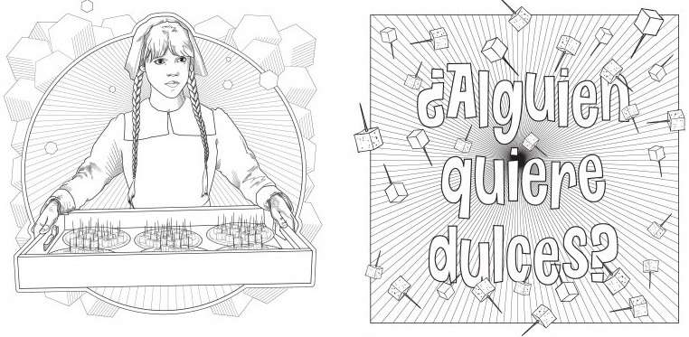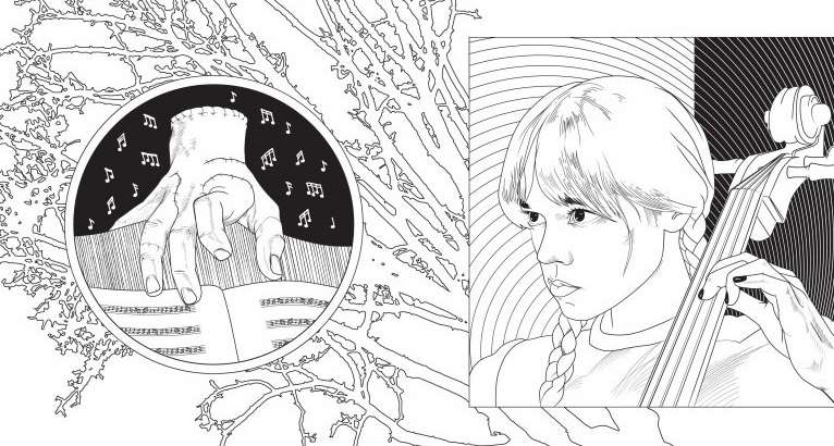 Si Miércoles Addams pudiera elegir las tonalidades con las que pintaría estas páginas, seguro que serían todas negras, ¡pero tú puedes darles vida como quieras!